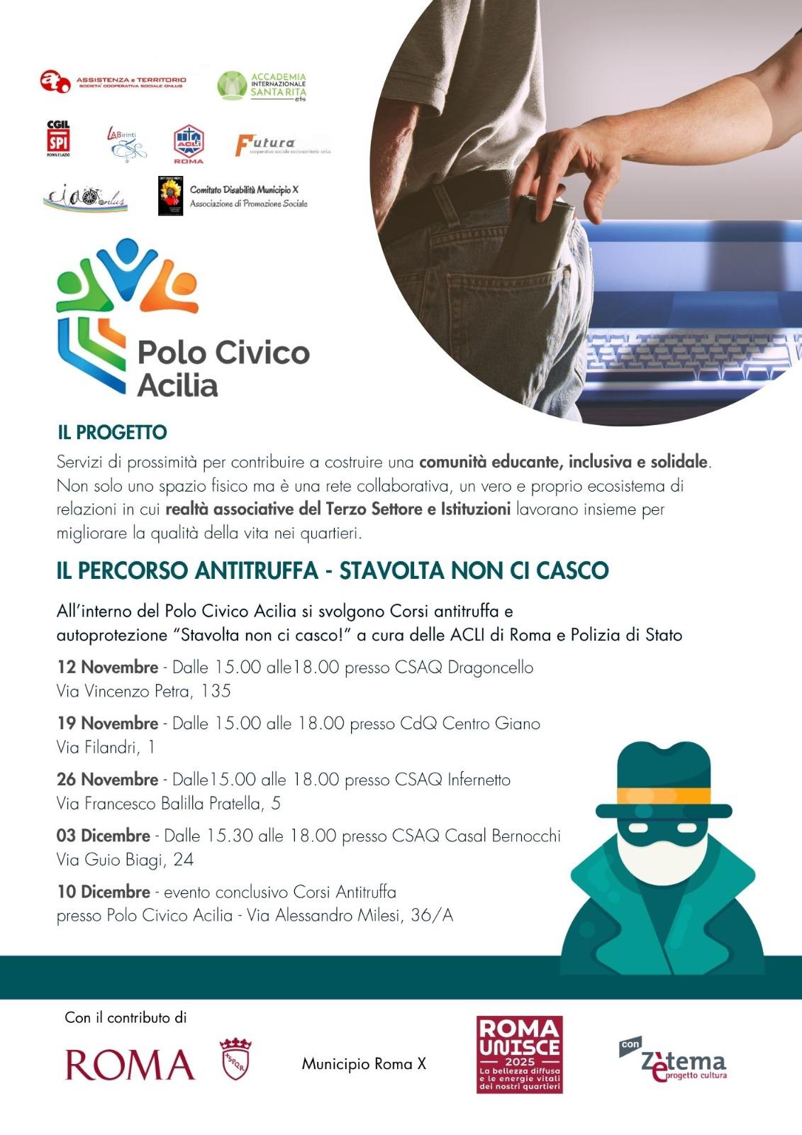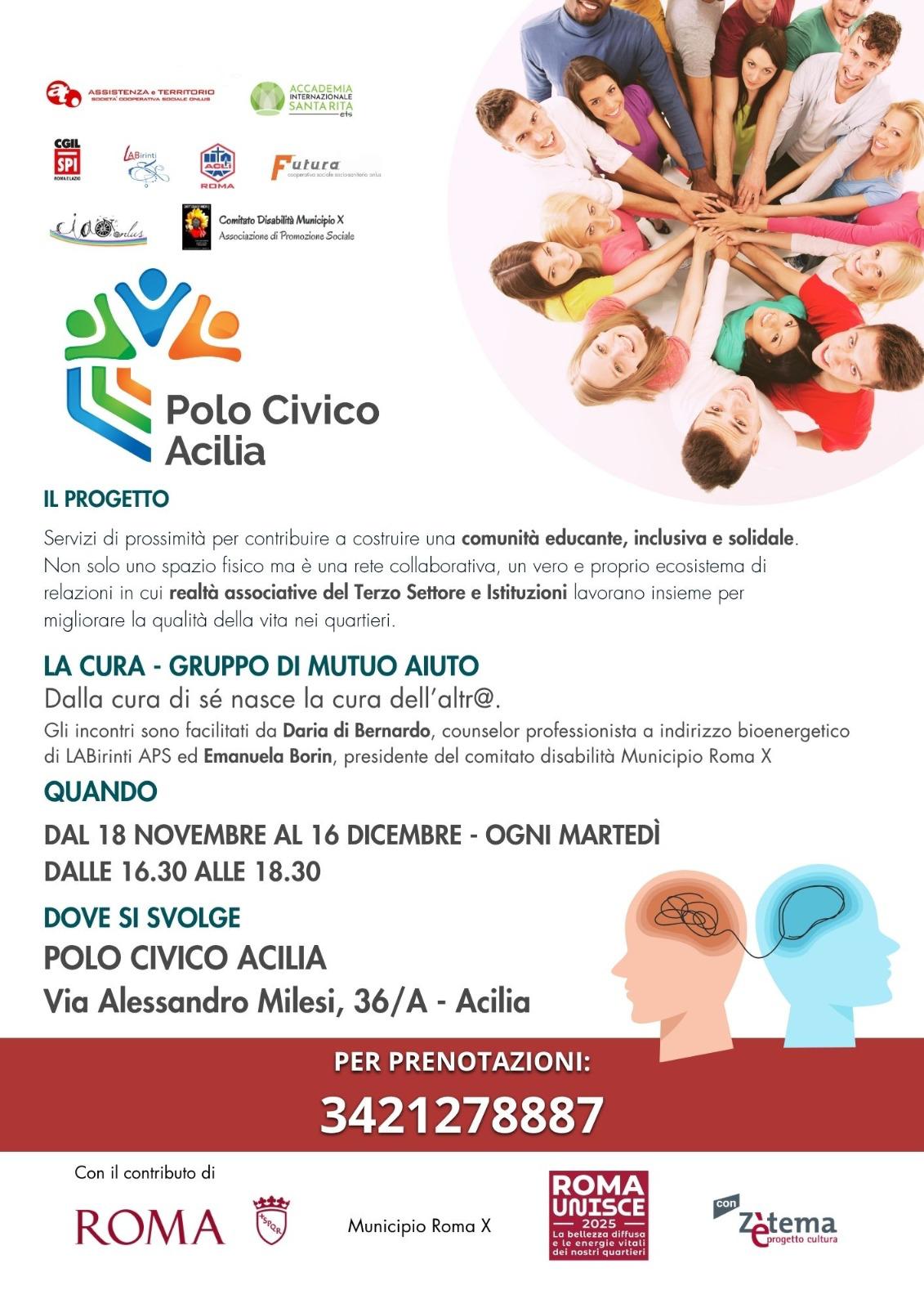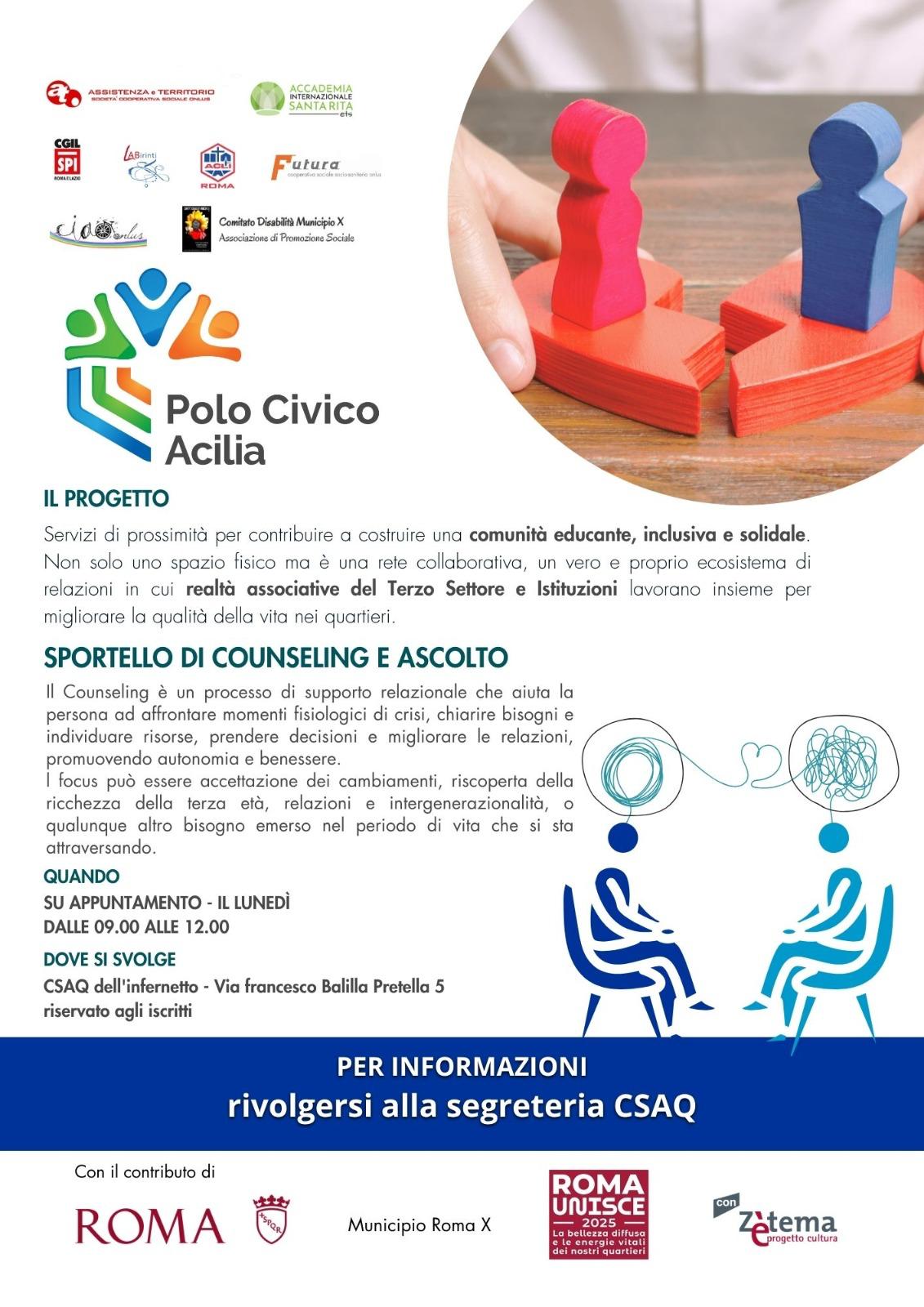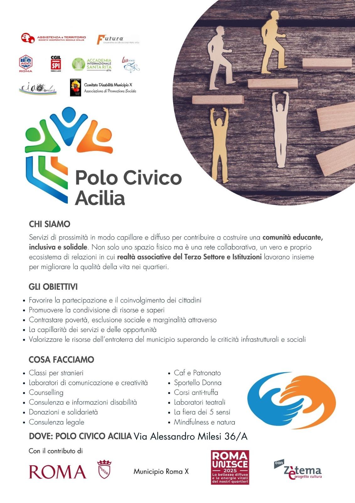 Il Polo Civico Acilia non è solo uno spazio fisico; è una rete collaborativa in cui la realtà associativa del Terzo Settore e le Istituzioni lavorano fianco a fianco per migliorare la qualità della vita nei nostri quartieri. È un punto di riferimento quotidiano, un luogo dove trovare ascolto, attenzione e condivisione.