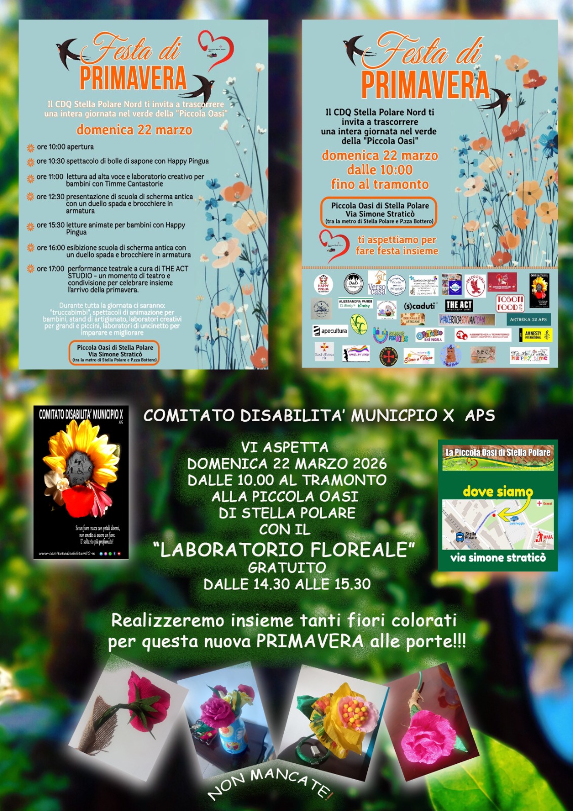 Dalle ore 14:30 alle 15:30, presso la Piccola Oasi, si terrà il “Laboratorio Floreale” gratuito. Durante l’attività, i partecipanti potranno realizzare insieme tanti fiori colorati per dare il benvenuto alla primavera alle porte, valorizzando le capacità espressive di ognuno in un clima di festa.