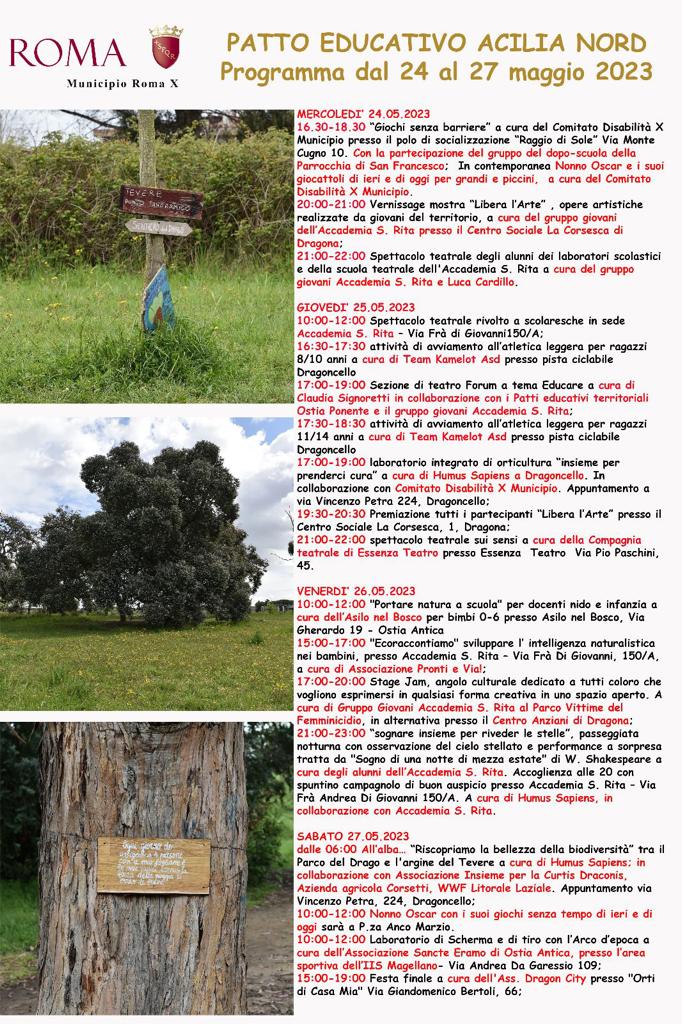 Dal 20 al 29 maggio 2023, in occasione della Giornata della Comunità Educante Municipio X che ricorre il 27 maggio data di nascita di Don Lorenzo Milani, si svolgeranno decine di iniziative di contrasto alla povertà educativa e alle tante criticità che riguardano, in particolare, bambini e minori.