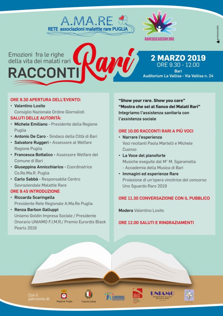 Sabato 2 marzo 2019, in occasione del Rare Disease Day 2019, parteciperemo all’evento organizzato dalla Rete A.Ma.Re Puglia, dal titolo “RACCONTI RARI – Emozioni fra le righe della vita dei malati rari“.