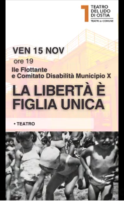 Dal 2022 cooperiamo cl’Ile Flottante nella gestione di un laboratorio teatrale permanente per persone con disabilità. L’incontro tra queste due realtà, che da anni operano su un territorio complicato come quello del Municipio X di Roma (che ha concesso il patrocinio gratuito per questo spettacolo), ha visto la nascita de LA LIBERTÀ È FIGLIA UNICA.