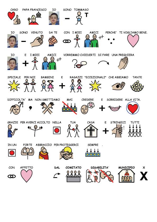 “Quando le parole non escono, quando le emozioni sono troppo grandi da spiegare…..” ecco che ci aiutano i simboli. Il piccolo Tommaso G. aiutato dalla mamma Rossella (consigliere del Comitato Disabilita’ Municipio X e Presidente dell’Ass.ne Il CAAmaleonte) ha scritto una lettera al Papa utilizzando la CAA, Comunicazione Aumentativa Alternativa.
