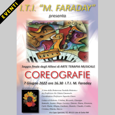 Il giorno 7 Giugno 2022 presso l’I.T.I. M. Faraday verrà presentato COREOGRAFIE, il Saggio finale degli Allievi di ARTE TERAPIA MUSICALE, a cura dell Dott.ssa Paolella Roberta e del Prof. De Chiara Emanuele, con la coordinazione del Prof. Saporito Ettore.