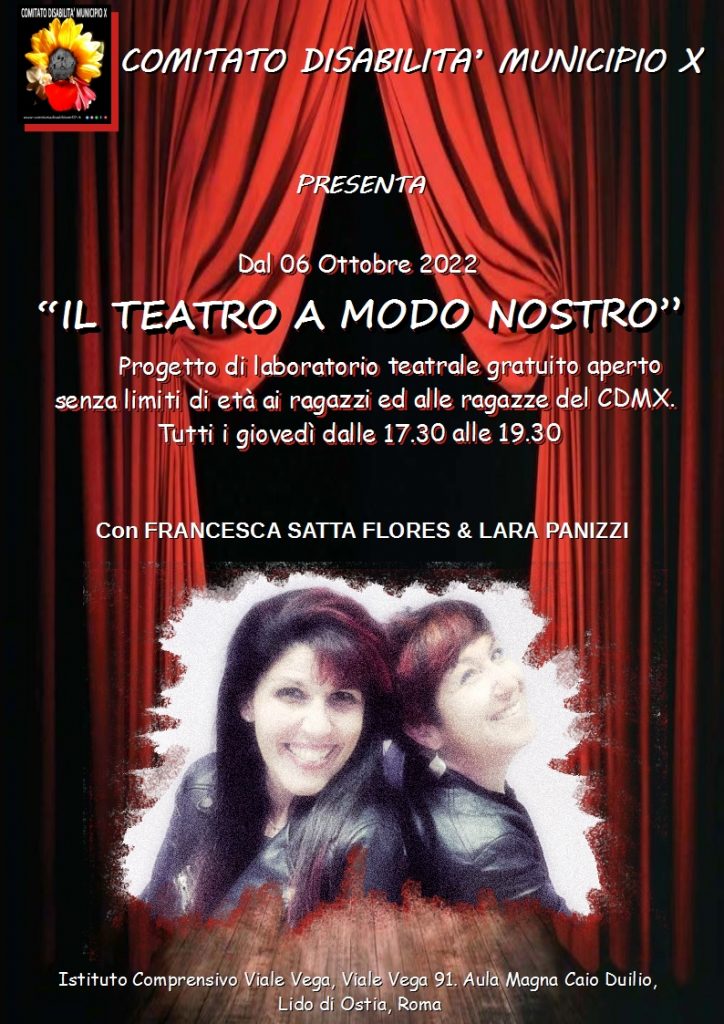 Il Comitato Disabilità Municipio X organizza gratuitamente un Laboratorio Teatrale con la direzione di Francesca Satta Flores e Lara Panizzi, rivolto ai ragazzi ed alle ragazze con disabilità del CDMX, senza limiti di età.