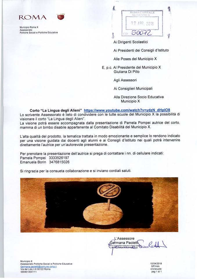 Il Comitato è lieto di condividere con tutti voi la soddisfazione per la mail che è appena arrivata dall’ Assessorato delle Politiche Sociali ed Educative del Municipio X, a nome dell’Assessore Germana Paoletti, che invita tutti gli Istituti scolastici del nostro municipio a visionare e promuovere il cortometraggio musicale “La lingua degli Alieni“.